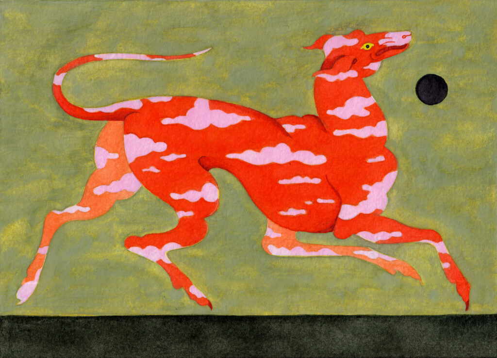 Windhund mit wolkigem Fell voller Geheimnisse, um Ihre Wohnung zu dekorieren oder die Spiele Ihres Kindes zu begleiten. Seine Haltung ist elegant und entschlossen, als würde er darauf warten, den Ball, den Sie ihm zuwerfen, anzuspringen.