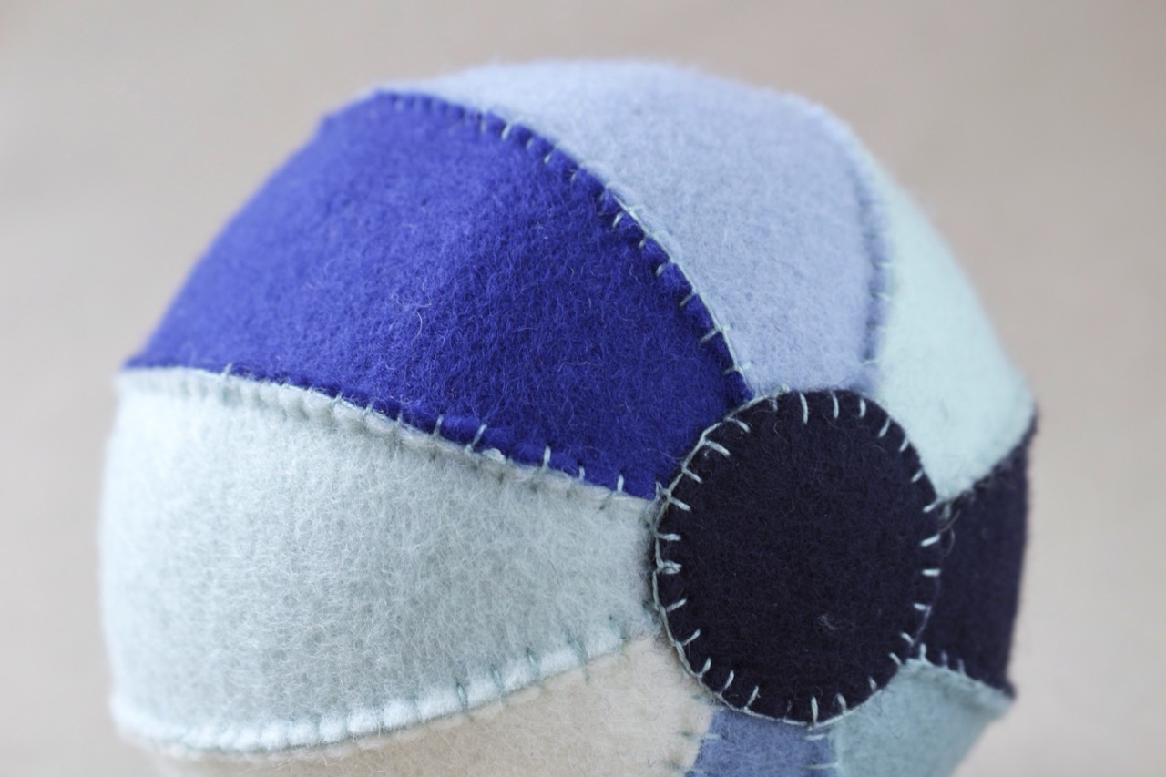 Dieser hübsche blaue Ballon aus handgenähtem Filz besteht aus 8 Facetten. Von Nachtblau über verschiedene Blautöne bis hin zu gebrochenem Weiß wird dieser harmonische Ballon die Spiele und Entdeckungen Ihres Babys und Kindes verzaubern.