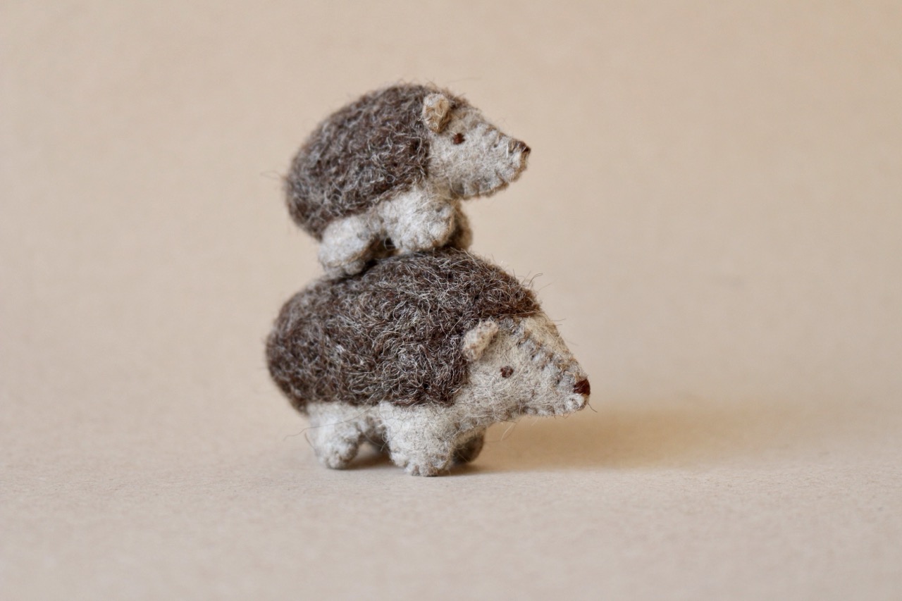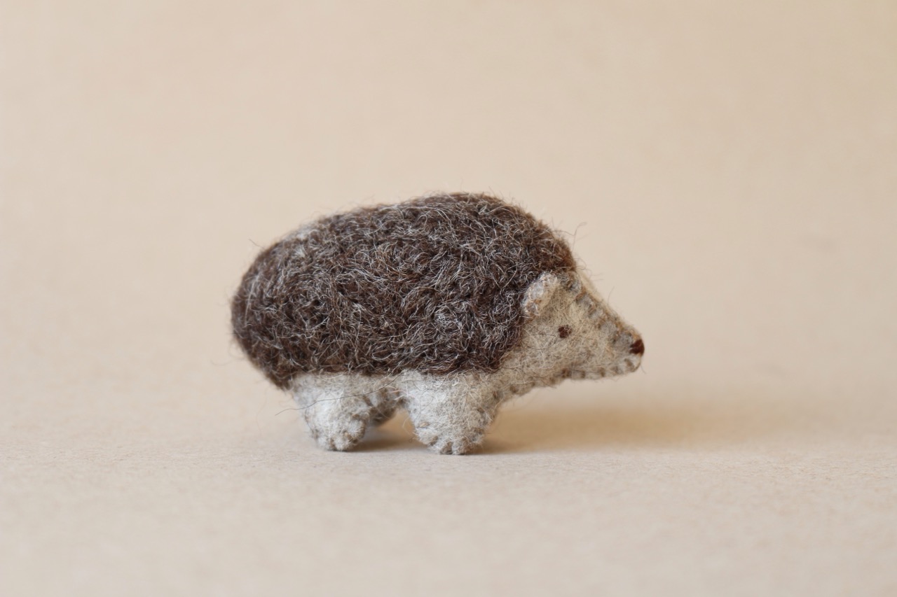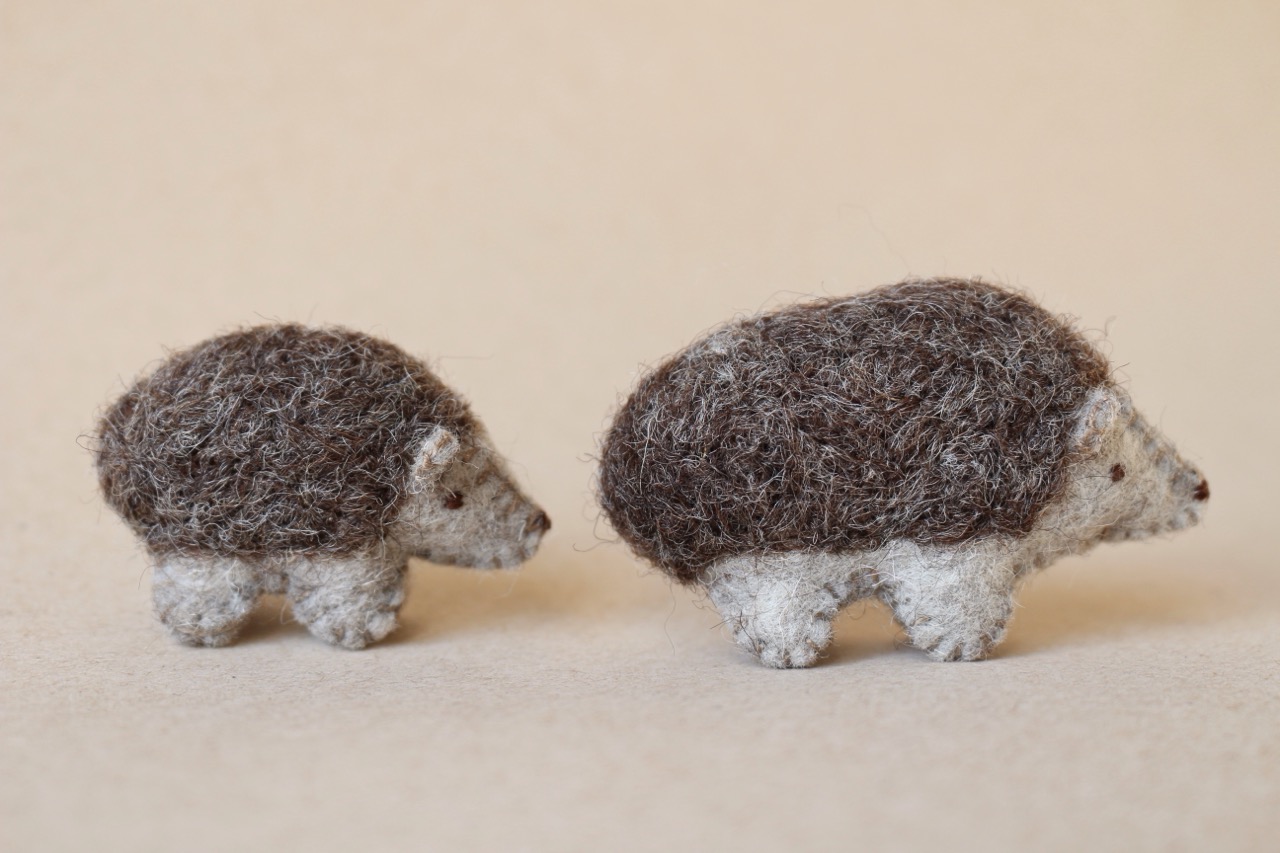 Erwachsener Igel aus Filz: Länge: 6,5 cm. Höhe: 4 cm. Dicke ≈ 2 cm.