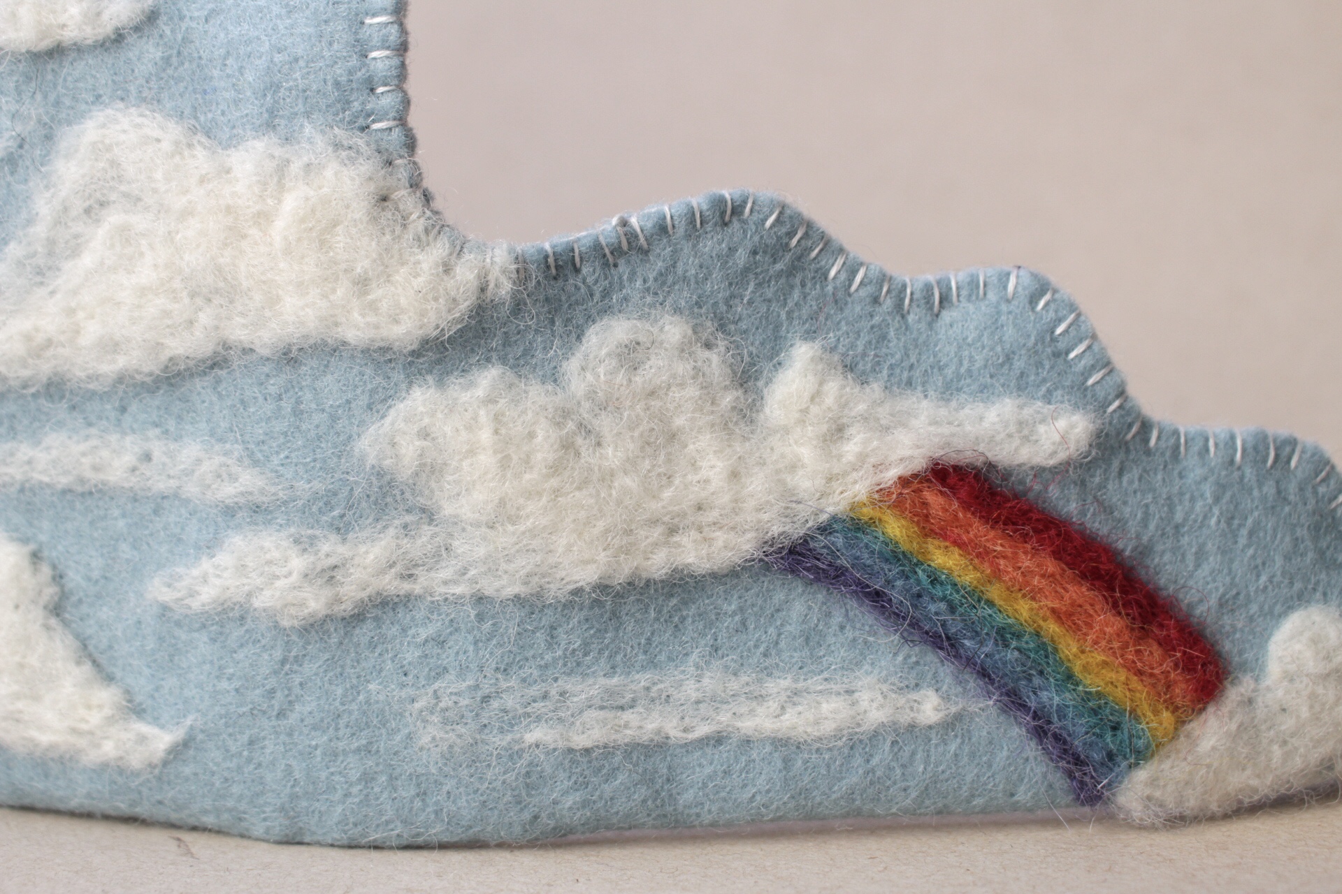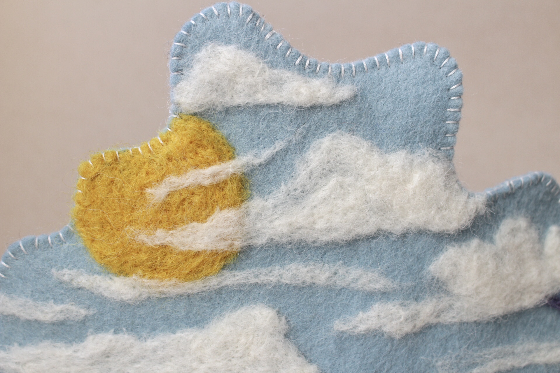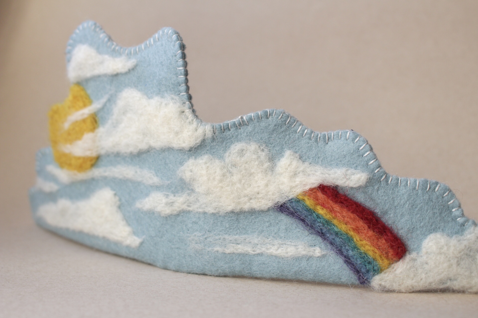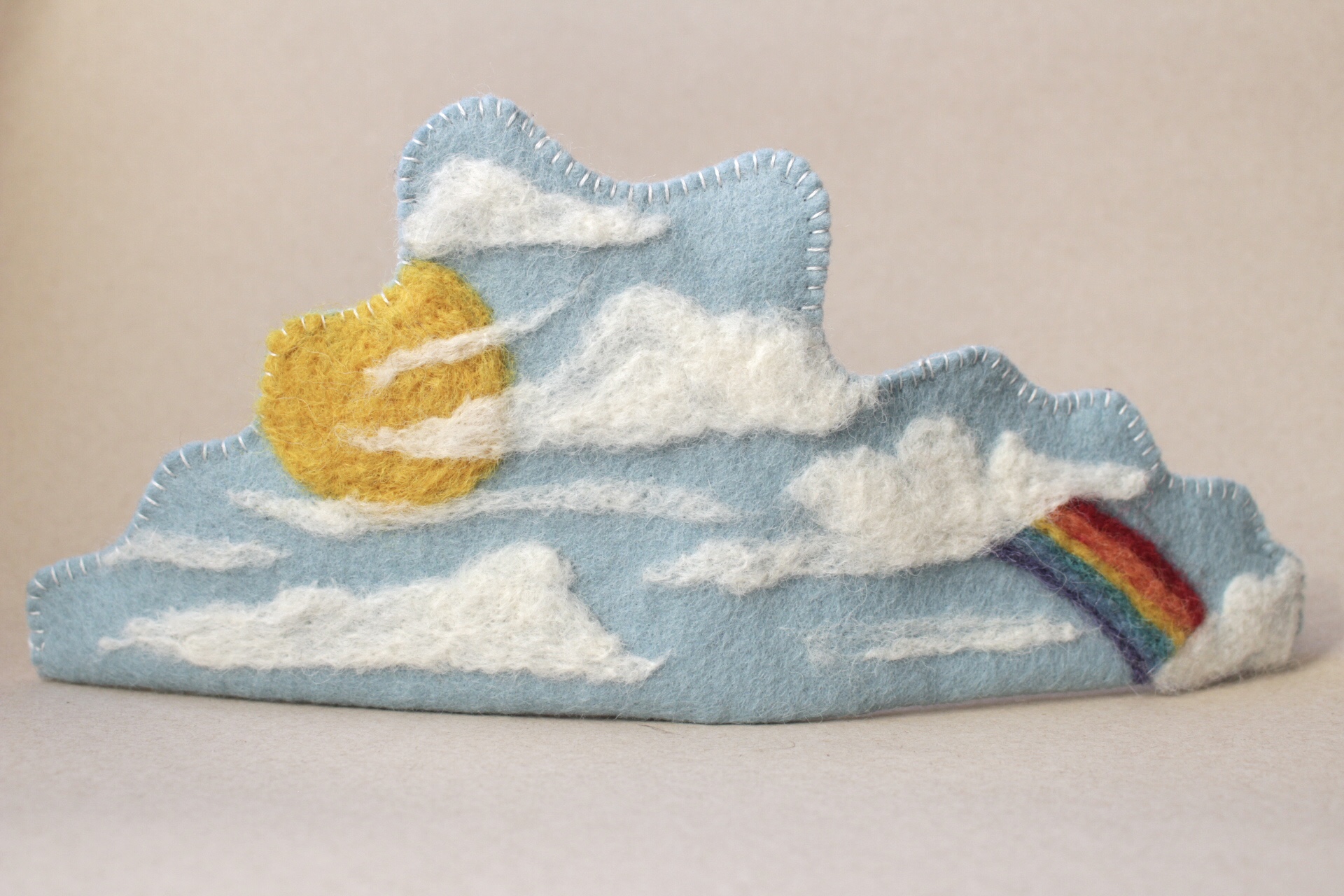 Die Sonne, die Wolken und der Regenbogen werden mit der Nadel gefilzt.