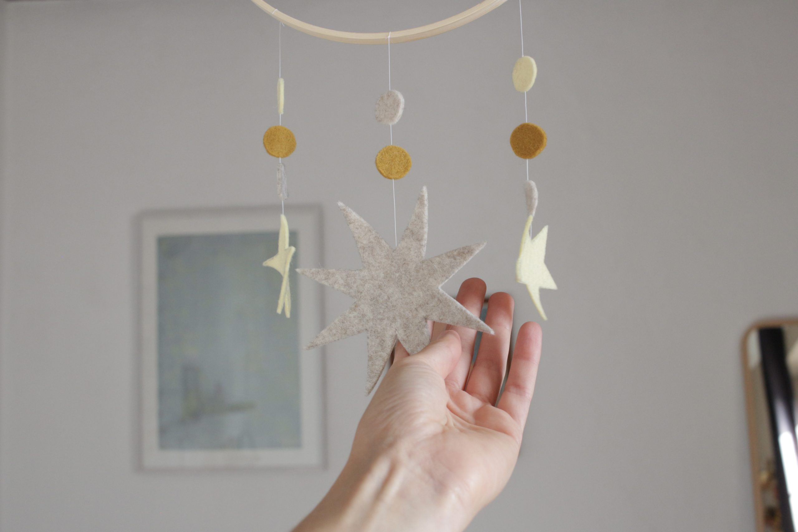 Wie Sie sicher schon bemerkt haben, sind die Mobiles nur für die Wahrnehmungszeiten gedacht. Sie können das Baby-Mobile aus Filz dann über der Kuschelecke aufhängen. Ideal ist es, wenn Sie es über dem liegenden Baby in einer Höhe von 30 bis 40 cm auf Brusthöhe anbringen, damit sein Blick in einem guten Winkel auf das Mobile fällt (also nicht über seinem Kopf). Stellen Sie sich vor, dass Sie es leicht anbringen und abnehmen können, damit es ein Spielzeug zur Förderung der Entwicklung ist und nicht nur ein dekoratives Element. So können Sie das Mobile Woche für Woche wechseln und dabei die Bedürfnisse Ihres Babys berücksichtigen.